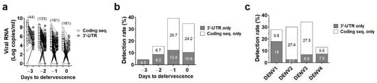 Rate of DENV genome detection by real-time RT-PCR specific to only 3′-UTR or coding sequence. (a) Viral RNA levels in plasma of 161 DENV infected patients collected since the first day of hospitalization to the day to defervescence quantified by RT-PCR specific to 3′-UTR (gray circles) or coding sequence (white circles) were re-analyzed according to “Day to defervescence”. The number of samples are labeled on the top of each group. Detection rate of DENV detected by only 3′-UTR (gray bar) or only coding sequence (white bar) were analyzed according to “Day to defervescence” (b) or DENV serotypes (c).