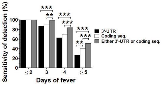 The occurrence of the DENV genome without a coding region or 3′-UTR found in the late period of illness (Figure 3) could reduce the sensitivity of viral genome detection by real-time RT-PCR, resulting in a false negative dengue diagnosis, especially when blood specimens were taken at the late acute febrile phase. We re-analyzed data from Figure 2c according to the day of fever onset, including group 1 (≤2 days after fever onset), group 2 (3 days after fever onset), group 3 (4 days after fever onset), and group 4 (≥5 days after fever onset). The cut-off value for DENV positive detection was the LoD described above. We considered a specimen to be positive when DENV was detected by either 3′-UTR or coding sequences. The proportion of DENV detection rate among assays and using dual regions were compared with 3′-UTR or coding sequences by McNemar’s exact test. The DENV detection rates of real-time RT-PCR using a pair of primers targeting both regions were up to 100% when specimens were collected at an early period of illness (≤2 day of fever). The detection rate of both regions decreased along with the day of fever onset (for 3′-UTR versus coding sequence, 87.5% versus 90.0%, and 62.8% versus 70.3% at day 3 and day 4 of fever, respectively) with similar proportions (McNemar’s p values = 0.6767 and 0.1614 at day 3 and day 4 of fever, respectively). However, when specimens were collected during the late febrile phase (≥5 days of fever), the detection rates of both regions were dramatically decreased to less than 40% (for 3′-UTR versus coding sequence, 27.1% versus 40.6%, McNemar’s p value 0.0024). As expected, dual region detection significantly increased the DENV detection rate at all disease days, starting from day 3 after fever onset. The sensitivity of dual region detection was as high as 99.4% at 3 days of fever, 87.9% at 4 days of fever, and 58.0% at ≥5 days of fever, which was significantly higher than 3′-UTR or coding sequence detections (Figure 4).