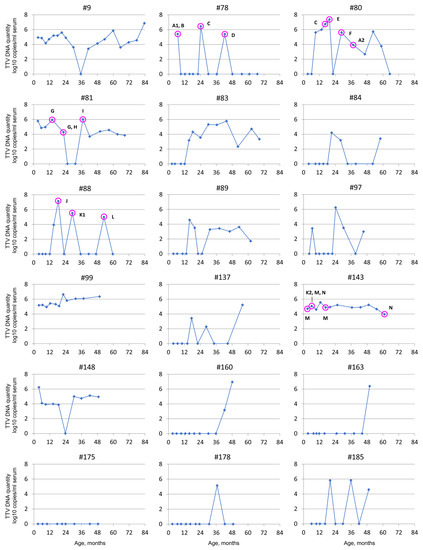 - Tyschik, E.A.; Rasskazova, A.S.; Degtyareva, A.V.; Rebrikov, D.V.; Sukhikh, G.T. Torque teno virus dynamics during the first year of life. Virol. J. 2018, 15, 86. [Google Scholar] [CrossRef] [PubMed]