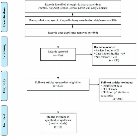 Our preliminary search of five scientific databases yielded 998 records. From that, 402 were excluded as duplicate records. Of the 596 remaining records, 293 articles were excluded after review of titles and abstracts. These included 6 review articles, 19 case reports, and 248 irrelevant articles. Then, the full text of 303 articles was evaluated, and 258 studies did not meet our inclusion criteria. Finally, we retrieved 45 full texts to assess the eligibility for inclusion, and these were included in the systematic review and meta-analysis. A PRISMA diagram of the screening process is depicted in Figure 1.