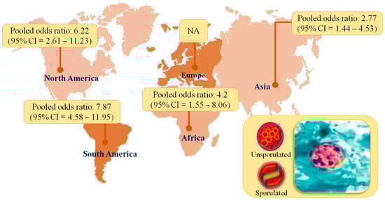 In our study, we showed that the highest and lowest prevalence rate among PLWHA was in North America and Asia, respectively. Cyclosporiasis is described in many countries, but it is most common in tropical and subtropical areas. It seems that the prevalence of this parasite is higher in underdeveloped and developing countries, and the effect of rainfall and weather on the prevalence of this parasite has already been shown []. We performed a meta-regression ratio for HIV and showed that the chances of contracting C. cayetanensis were 4.36 (95% CI, 2.00–9.48) in PLWHA.
