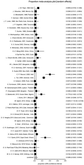 The primary aim was to assess the global prevalence of Cyclospora parasitosis in PLWHA. The statistical heterogeneity between studies was assessed using Cochran’s and I2 tests. For meta-analysis purposes, a random-effects model was used. The meta-analysis was completed with the trial version of the StatsDirect statistical software (www.statsdirect.com, accessed on 7 March 2022). A forest plot was applied to show the heterogeneity between studies. It showed proportions of individual studies and total prevalence of C. cayetanensis.