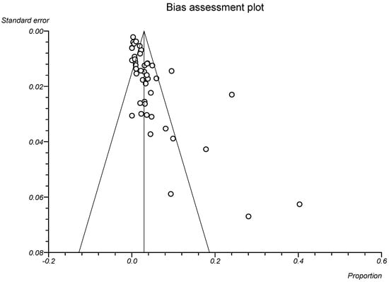 The estimated global prevalence of Cyclospora parasitosis in PLWHA ranged from 0.0% to 40.3%. Of 9310 samples, 364 were infected with C. cayetanensis. The estimated global pooled prevalence of C. cayetanensis infection in PLWHA using the random effects model for meta-analysis was 3.89% (95% CI, 2.62–5.40(. The prevalence of the parasite in North America, South America, Asia, and Africa was estimated at 6.22% (95% CI 2.61–11.23, 94/1283), 7.87% (95% CI, 4.58–11.95, 15/201), 2.77% (95% CI, 1.44–4.53, 576/186), and 4.2% (95% CI, 1.55–8.06, 69/2088), respectively. The geographic distribution of C. cayetanensis infection in PLWHA is shown in Figure 2. The pooled prevalence of C. cayetanensis infection in men compared to women (OR = 1.72, 95% CI, 0.79–3.73, p = 0.1647) was also estimated. Furthermore, the pooled prevalence of C. cayetanensis in PLWHA with diarrhea compared with/without diarrhea was estimated (OR = 3.23, 95% CI, 1.38–7.54, p = 0.0066). The pooled prevalence of C. cayetanensis in patients with a CD4 counts <200 cells/mL compared to patients with a CD4 count of more than 200 cells/mL was estimated (OR = 4.07, 95% CI, 1.37–12.12, p = 0.0115). Moreover, the pooled prevalence of C. cayetanensis in patients who did not receive HAART compared with patients with HAART was estimated (OR = 2.07, 95% CI, 0.29–14.81, p = 0.4668) (Table 3), and the pooled prevalence of C. cayetanensis in PLWHA compared to people without HIV was estimated (OR = 4.36, 95% CI, 2–9.48, p = 0.0002). There was a broad difference in the prevalence rate between various studies. Furthermore, the Cochran’s Q statistic was (Q = 506.06, df = 44, p < 0.000, I2 = 91.3%, 95% CI, 89.6%–92.6%) (Figure 3). Inspection of the bias assessment plot showed publication bias, and a statistically significant Egger’s regression suggests the possibility of publication bias (Figure 4).