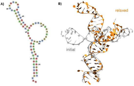 As reported by experimental works [15,43,44], the first stem-loop of the WNV 5-UTR is composed of 74 nucleic acids organized in two stem-loop (SL) sections at positions 4–16/61–74 (first) and 20–28/37–45 (s)—see Figure 1A. The two SLs are connected by a short 3-residue segment on one side and by a large 15-residue loop on the other side. The second section adopts an ideal helix shape terminated by a short loop (residues 29–36), while the first one harbors an extruded uracil residue at position 67.
