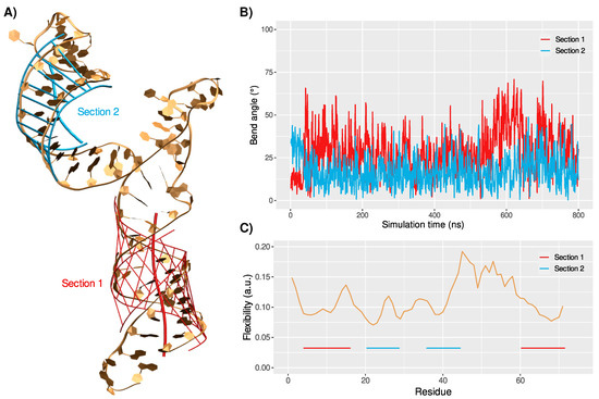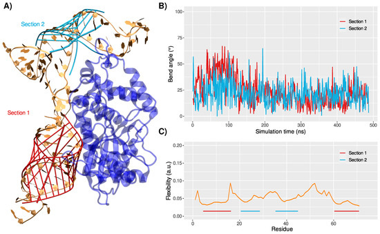 Structural analysis of the RNA strand was performed using the Curves+ program [34], and the RMSD and distances were monitored using the cpptraj module of AMBER18. The bend angle between the two stems was computed as the angle between the centers of mass of the first stem section, the base of the large loop (residues 17–19, 46–48, and 58–60), and the second stem section. The flexibility profiles were generated using a program derived from a machine learning protocol described by Fleetwood et al. [35], following a strategy successfully used on different biomolecules [36,37,38]. Conformational ensembles were clustered with respect to the RMSD of the RNA and/or the protein using a hierarchical agglomerative method with average-linkage to calculate inter-cluster distances.