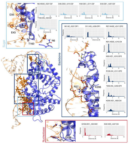 More specifically, an extensive hydrogen bonds network is observed between the first stem section, mainly featuring R27, N31, K60, R195, T203, and K206, and the nucleic phosphates of rG17 (3.0 ± 1.7 Å), rU16 (1.9 ± 0.4 Å), rG15 (2.9 ± 0.7 Å), rC11 (2.0 ± 0.2 Å), rU59 (2.8 ± 1.4 Å), and rA60 (3.2 ± 0.8 Å), respectively—see Figure 5. Such non-specific interactions are also found between the second stem region and the protein: rG37 with the 5 terminal M1 and rU39 with S11.