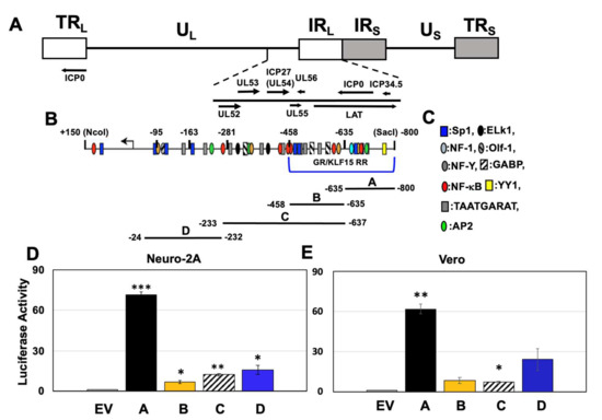 Location of ICP0 gene and promoter/enhancer sequences within the IRL and TRL repeats of the HSV−1 genome. (Panel A): Schematic of HSV-1 genome. Unique long (UL) and unique short (US) segments are flanked by the long internal or terminal repeats (IRL and TRL: white rectangles) and short internal or terminal (IRS and TRS: gray rectangles). Location of known genes in IRL, including ICP0, are shown. A copy of ICP0 is also present in the TRL. (Panel B): Schematic of ICP0 promoter, and location of potential transcription factor binding sites (Panel C) relative to the start site of ICP0 mRNA (arrow). Four fragments (A–D) were used in this study and were cloned upstream of the pGL4.24[luc2/minP] firefly luciferase reporter plasmid. Neuro-2A (Panel D) or Vero (Panel E) cells were transfected with 0.5 ug of the denoted CRM constructs and a Renilla luciferase plasmid (0.05 ug). At 48 h after transfection, dual luciferase activity was performed. Fold activation was calculated relative to pGL4.24[luc2P/minP] or empty vector (EV) for each construct. Results are the mean of three experiments, and error bars indicate standard error. The *, ** and *** denote a significant difference of p < 0.05, p < 0.005 and p < 0.0005 respectively compared to the EV luciferase activity as determined by Student’s t-test. Statistical analysis was performed as described in Materials and Methods.