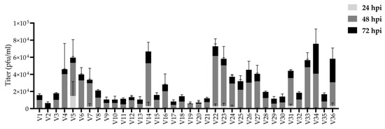 To determine the virus yield from the clinical isolates in Vero cells, the cells were infected with 5 pfu/cell and a supernatant sample was collected at 24, 48, and 72 h post infection (hpi) to quantify the released virus. The results are presented in a stacked graph (Figure 1). All of the clinical isolates replicated in Vero cells. The isolates V2, V19, and V20 represented the isolates with the three lowest, and V14, V22, and V34 represented the three highest overall yields. The profiles of the yields were similar between a majority of the isolates, with the most abundant shedding at the 48 h time point and plateauing at the 72 h time point. Hence, the majority of the viral production took place between the 24- and 48-h time points. The evident outliers of the group were isolate V2, which displayed abundant shedding later than other isolates, peaking at 72 hpi, and isolate V5 for which the yield at 24 hpi was higher than of any other isolate.