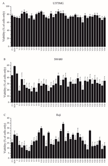 The oncolytic potential of the strains was studied in cancerous cell types representing neuroglioma (U373MG), adenocarcinoma (SW480), and B-cell lymphoma (Raji) (Figure 5). After a 2 pfu/cell infection and 4 days of incubation, all isolates had decreased the viability of each of the cancer cell types, with most pronounced effects detected in Raji cells and least pronounced effects detected in U373MG cells (Figure 5). In our panel of cancer cell lines, the oncolytic potential of the isolates and how they performed in comparison to the reference strains or to each other was dependent on the cell type (Figure 5). However, in previous research [5], the relative differences in the oncolytic potential of the compared two clinical strains and 17+ actually remained across cell lines representing breast adenocarcinoma, colorectal adenocarcinoma, and melanoma, although no statistical significances of improved oncolytic capability were reported. In another previous research article, eight isolates, scored most lytic of twenty-nine clinical isolates, were compared in seven cancer cell types by visual assessment for their lytic capabilities [6]. Of the eight, one isolate was evidently most lytic across the cell types, but the oncolytic capability of others appeared dependent on the cell type. Even though the differences were assessed by visual ranking, which might be subjective and thus suboptimal, these results were similar to ours, as we also found the oncolytic capability of the strains to be rather dependent on the cell type but identified some outstanding oncolytic candidates. Altogether, in our study, numerous clinical isolates that were significantly more oncolytic than some or all of the reference strains could be identified in each cancer cell type (Figure 5). Notably, there were two clinical isolates, V27 and V35, which were more oncolytic than two or more reference strains across all cell types (Figure 5). If the precise cancer indication would not be known for an intended oHSV, these would be the strains to continue research with.