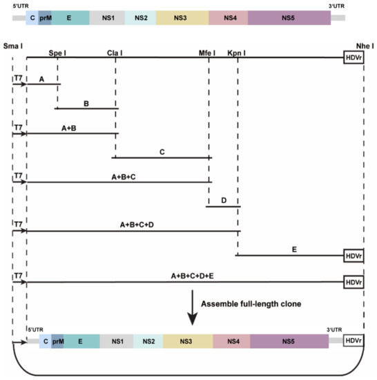 Schematic diagram of the cloning strategy to construct infectious clone for mosquito flavivirus strain YN15-283-02. Genome distribution and restriction sites used for genome assembly are shown. Five cDNA fragments (A–E) covering the complete MFV YN15-283-02 genome were amplified using RT-PCR. A T7 promoter was fused upstream of the 5′UTR in fragment A and an HDVr downstream of the 3′UTR in fragment E.