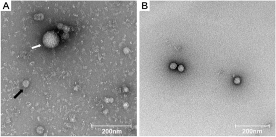 To concentrate the virions, the pooled supernatants were centrifugated at 125 g at 4 °C for 10 min. The sediment of cell debris was discarded. Then, the supernatant was transferred to an SW32 ultracentrifuge tube containing a 20% wt/vol sucrose cushion. Ultracentrifugation was performed at 31,000× g and 4 °C for 3 h. The sediment was resuspended immediately in 100 μL of phosphate-buffered saline (PBS). The suspension was filtered through a 0.5 mL Amicon® Ultra ultracentrifugal filter device. The collected virions were suspended in PBS, and drops were dispensed on Formvar-coated copper grids and stained with 2% uranyl acetate. The excess stain was removed in the usual manner, and TEM was performed using a model Tecnai G2 20 TWIN operating at 200 kV (FEI, Hillsboro, OR, USA).