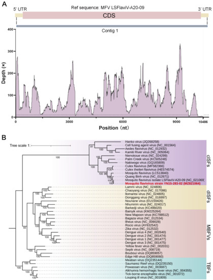 (A) The sequencing depth and the coverage of contig 1 when aligned to the reference sequence: MFV LSFlaviV-A20-09. The X-axis and Y-axis indicates position and sequencing depth, respectively. (B) Maximum likelihood tree was plotted based on conserved amino acid sequences of viral polyprotein. The GenBank numbers of representative viruses were coded behind the virus name. cISFs (classical insect-specific flaviviruses)—purple, dISFs (dual-host affiliated insect-specific flaviviruses)—yellow, MBFVs (mosquito-borne flaviviruses)—red, TBFs (tick-borne flaviviruses)—cyan. The bootstrap value is 5000. The best-fit model was estimated as the LG + F + I + G4.