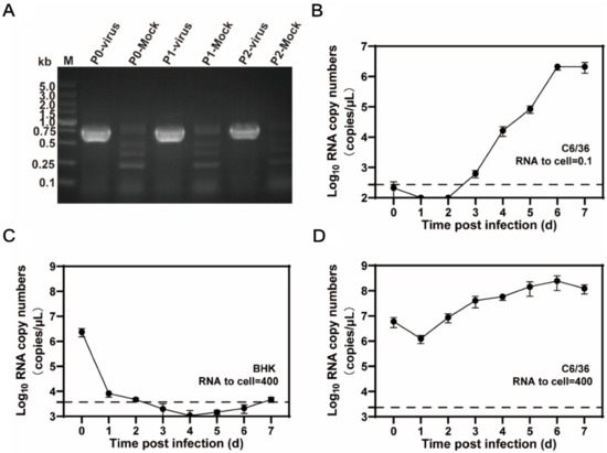 When C6/36 cells were infected with rMFV YN15-283-02 at a ratio of viral RNA copies to cell number of 0.1, the viral RNAs significantly increased and reached a peak (2 × 106 copies/μL) at 6 d.p.i. in the harvest supernatants. This indicates the efficient replication of the rMFV YN15-283-02 (Figure 4B) in C6/36. To further confirm the host specificity of rMFV, mammalian BHK-21 cells and mosquito C6/36 cells were infected with high doses of rMFV at a ratio of viral RNA copies to cell number of 400, and the result showed that rMFV cannot replicate in BHK cells (Figure 4C,D).