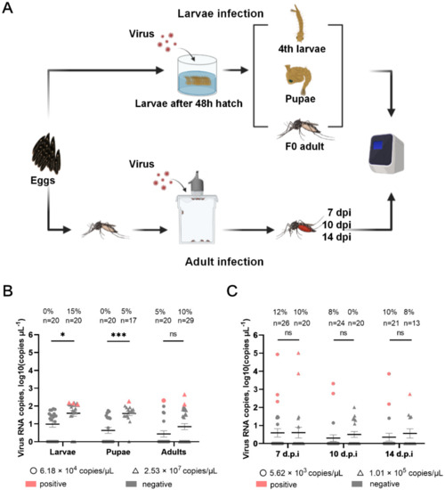 The result of mosquito infection through oral infection. (A) The process of mosquito infection was divided into larvae infection through feeding in water and adult infection through blood-feeding. (B) The larvae mosquito infection was detected via qRT−PCR. (C) The adult mosquito infection was detected via qRT−PCR. (B,C) The detection limit was 2.08 Log10 copies/μL (Ct = 35); n stands for the total number tested; the positive and negative samples are indicated in red and gray, respectively; ns (p > 0.05), * (p < 0.05), *** (p < 0.01).