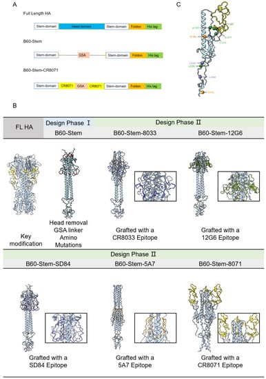 The design of the HA stem strategy and key candidates. (A) Schematic of full length, B60-Stem and B60-Stem-CR8071 HA (B/Brisbane/60/2008(Victoria lineage); PDB:4FQM). (B) The prediction model of each design phase by AlphaFold2. GSA linker was colored in red, CR8033 epitope (blue), 12G6 epitope (green), SD84 epitope (purple), 5A7 epitope (orange) and CR8071 epitope (yellow) (drawn by PyMOL modeling software). (C) Ribbon HA stem model with color-coded modifications.