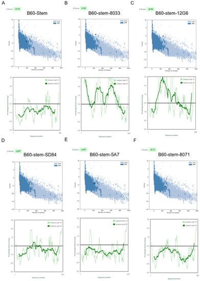 Three-dimensional vaccine design structure validation by ProSA-web. The Z-score of the refined models (A) (B60-Stem: −3.75); (B) (B60-Stem-8033, 0.35); (C) (B60-Stem-12G6: −0.03); (D) (B60-Stem-SD84: −2.67); (E) (B60-Stem-5A7: −4.07); (F) (B60-Stem-8071: −5.71). ProSA-web also plots the residue scores to check the local model quality and the negative values suggest no erroneous parts of the model structure.