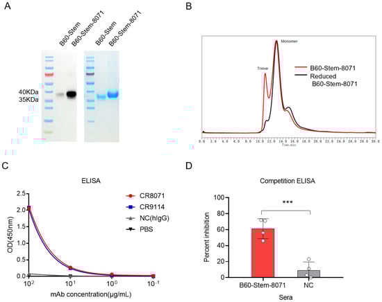 Characterization and conformational determination of B60-Stem-8071 HA. (A) The image of SDS-PAGE and the Western blot of purified B60-Stem-8071. (B) The HPLC analysis of B60-Stem-8071. B60-Stem-8071 under reducing condition (black) and non-reducing condition (red). (C) Binding curves of broadly neutralizing antibodies CR8071 (in red), CR9114 (in blue) and negative (NC) group (non-influenza antibody in grey). ELISA reactivity to purified B60-Stem-8071 (D) using a competition ELISA assay with two antisera (B60-stem-8071 and NC). CR8071 was used as a competitor, and NC group mice vaccinated with non-influenza protein. The data represented the average of four independent experiments and error bars indicated the standard errors of the means (SEM), with asterisks representing significant differences (*** p < 0.001).