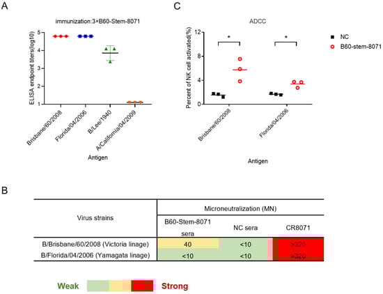 Reactivity of sera from mice vaccinated with B60-stem 8071 against divergent IBV in vitro. (A) Broad binding activity of sera from mice vaccinated with B60-stem-8071 against representative inactivated viruses from three influenza B lineages and an IAV pdmH1N1 strain by ELISA. (B) Neutralization activity of sera from mice vaccinated with B60-stem-8071 or adjuvant (NC group) to IBV by MN assay. The neutralization strength is color coded from green (weak) to red (strong). The value <10: no reactivity (filled with green); 10–40: moderate reactivity (filled with yellow); >40: high reactivity (filled with red). Asterisks represented significant differences Significance (* p < 0.05). (C)The ADCC effect of sera from mice vaccinated with B60-stem-8071 or NC group.
