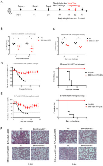 B60-Stem-8071 conferred robust broad protection against cross-lineage IBV infection in vivo. (A) Diagram showed experimental plan. Twelve mice per group vaccinated with B60-Stem-8071 or adjuvant (NC group) were infected with B/Brisbane/60/2008(Victoria lineage) or B/Florida/4/2006(Yamagata lineage) intranasally. Three mice per group were euthanized on the third and the sixth day post-infection. Bronchoalveolar lavage fluid was collected to determine viral titer, and lungs were harvested for histopathology. (B,C) Graph showed mean lung virus titer ±SEM (n = 3 mice) on days 3 and 6 post-infection, with asterisks representing significant differences Significance (* p < 0.05, ** p < 0.01). (D,E) Mouse body weight curves ±SEM (n = 6 mice) and survival curves. (F) The H&E staining of lung sections harvested from B60-Stem-8071 or NC group.