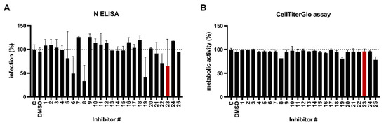 Screening of kinase inhibitors against SARS-CoV-2. (A) Compounds were prediluted in medium and added onto Caco-2 cells (final conc. 1 µM). Afterwards, cells were infected with SARS-CoV-2 Alpha (MOI of 0.0005) and 2 days later, infection was quantified by an in-cell ELISA. Values were corrected for the background signal derived from uninfected cells and untreated controls were set to 100% infection. (B) In parallel, a viability assay was performed under conditions corresponding to the respective infection assay. Metabolic activity of the cells was assessed 2 days later using the CellTiter-Glo® Luminescent Cell Viability Assay. Untreated controls were set to 100% viability. Shown are mean values ± SD from one experiment performed in triplicates. Red bar indicates compound of interest SB431542 (Inhibitor # 23), C: control.