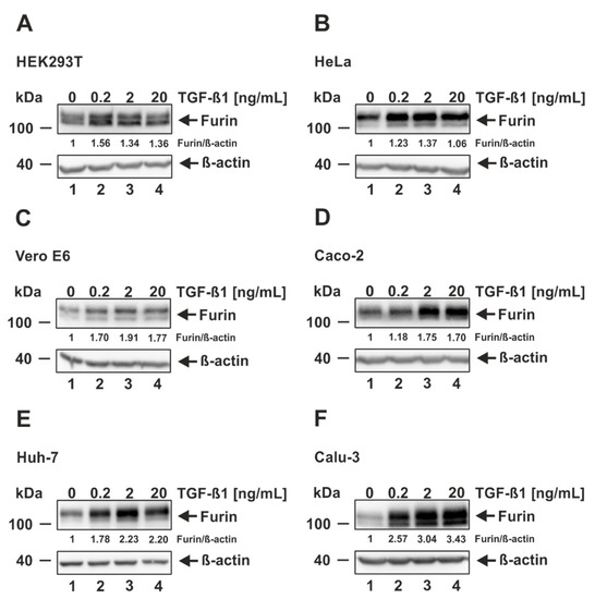 Induction of furin expression by TGF-ß1. (A) HEK293T, (B) HeLa, (C) Vero E6, (D) Caco-2, (E) Huh-7, and (F) Calu-3 were incubated for 18 h with indicated concentrations of TGF-ß1 or the solvent control 4 mM HCl 0.1% bovine serum albumin (0 ng/mL TGF-ß1). Western blot analyses were performed to detect furin and ß-actin. Protein levels of furin and ß-actin were quantified via densitometric analyses utilizing the Image Lab Software. Protein levels without the addition of TGF-ß1 (0 ng/mL) were set to 1.