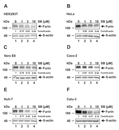 Decrease of furin expression by the ALK5 inhibitor SB431542. (A) HEK293T, (B) HeLa, (C) Vero E6, (D) CaCo-2, (E) Huh-7, and (F) Calu-3 were incubated for 24 h with the indicated concentrations of SB431542 (SB) or the solvent control DMSO (0 µM). Western Blot analyses were performed to detect furin and ß-actin. Protein levels of furin and ß-actin were quantified via densitometric analyses utilizing the Image Lab Software. Protein levels without SB (0 µM) were set to 1.
