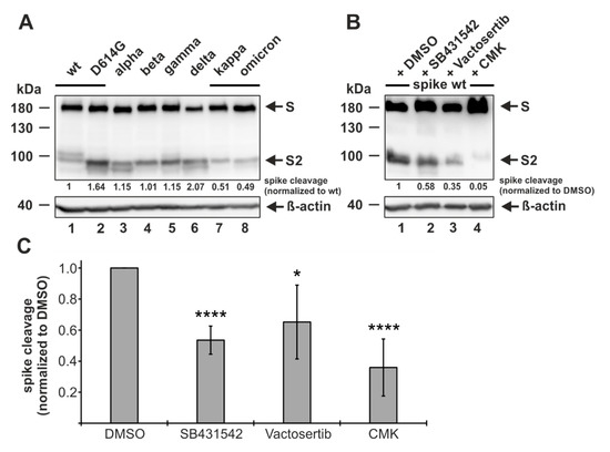It has already been demonstrated that either directly inhibiting furin or mutating/deleting the multibasic cleavage site reduces or even prevents the proteolytic processing of the spike protein [5,6,19,20,21,23,60,61]. Thus, we speculated that utilizing the ALK5 inhibitor, which has been shown to markedly decrease furin expression, could have the same outcome. To address this, we made use of HEK293T cells that are routinely used to analyze spike processing after the transfection of plasmids coding for spike proteins [5,9,11]. Beforehand, we analyzed different SARS-CoV-2 spike variants for spike cleavage in HEK293T cells. To this end, HEK293T cells were transfected with plasmids coding for Wuhan-Hu-1 wildtype (wt) spike protein and additionally with plasmids coding for spike proteins of formerly (D614G, alpha, beta, and gamma) and currently (delta and omicron BA.1) circulating VOCs as well as of one former variant of interest (kappa). Two days later, the cells were harvested and subjected to Western blot analyses by utilizing an antibody specific for the S2 subunit of the spike protein. We observed not only equal spike protein expression levels for all SARS-CoV-2 strains but also efficient proteolytic processing. According to earlier studies, we detected one major band at 180 kDa indicative of the uncleaved spike protein and two bands at approximately 100 kDa reflecting the spike cleaved at S1/S2 and at S2′ (Figure 5A). In comparison to the wt, a strongly enhanced spike cleavage was found for delta but not for other variants, which is consistent with the findings of other groups (Figure 5A, compare lanes 1 and 6) [62,63]. In sharp contrast, the omicron BA.1 variant displayed a highly decreased spike cleavage efficiency, which is also in accordance with a recently published study (Figure 5A, compare lanes 1 and 8) [64]. After having shown that the spike is efficiently cleaved in HEK293T cell, we pursued further to investigate the effect of ALK5 inhibition on spike cleavage. To make sure that ALK5 was completely blocked before the biosynthesis of the spike protein started, we pre-incubated HEK293T cells overnight with either the solvent control DMSO, the ALK5 inhibitor SB431542, the ALK5 inhibitor Vactosertib (which is currently undergoing clinical trials), or the direct furin inhibitor CMK as a positive control. Afterwards, HEK293T cells were transfected with plasmids coding for wt spike protein. Two days later, the cells were harvested and subjected to Western blot analyses by utilizing an antibody specific for the S2 subunit of the spike protein. As seen in Figure 5B, the spike cleavage was markedly decreased in cells pre-incubated with the ALK5 inhibitors SB431542 and Vactosertib, and almost completely abolished by CMK. A quantitative evaluation of the independent experiments demonstrated that both ALK5 inhibitors reduce the amount of cleaved spike up to two-fold in comparison to the DMSO treated cells, whereas the positive control CMK leads to an almost three-fold reduction (Figure 5C).