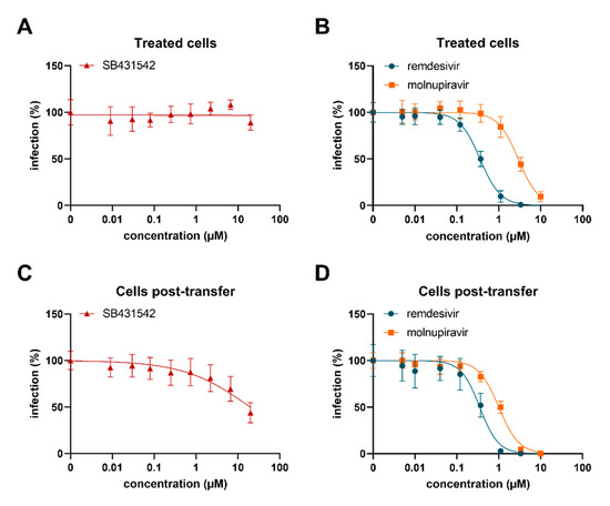 SB431542 reduces infectious virus production. (A,B) Calu-3 cells were treated with SB431542, remdesivir, or molnupiravir and infected with SARS-CoV-2 Delta at an MOI of 0.0005. Infection rates were determined two days post infection by in-cell ELISA targeting nucleocapsid. (C,D) Supernatants of (A,B) obtained two days post infection were transferred to non-infected Calu-3 cells. Infection rates were measured one day later by in-cell ELISA. Values shown represent % infection relative to infected controls containing no inhibitor. Values are derived from three independent experiments each performed in triplicates and represent mean values ± SD.
