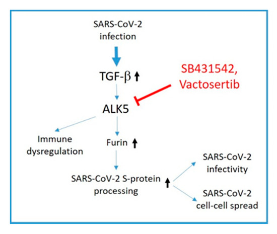 ALK5 inhibition as a potential therapy option for SARS-CoV-2 infection. SARS-CoV-2 infection leads to upregulation of TGF-β and subsequent ALK5 activation. As shown in this study, ALK5 activation induces furin expression which fosters SARS-CoV-2 S-protein processing. This increases SARS-CoV-2 infectivity and cell–cell spread. ALK5 inhibition by SB431542 or Vactosertib interferes with furin upregulation and may also block TGF-β driven immune dysregulation.