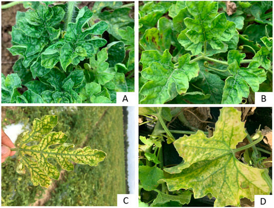 Symptoms observed on the field during the survey include: on watermelon (A–C), leaf crinkling and bunchy top with upward curling appearance of young leaves (A), crinkling of young leaves with mild yellowing (B), severe interveinal chlorosis of the leaf (C). On cantaloupe, yellowing and interveinal chlorosis on the older leaf (D). Watermelon (A,B) and cantaloupe (D) was collected in spring 2021 and watermelon (C) was collected in fall 2019.