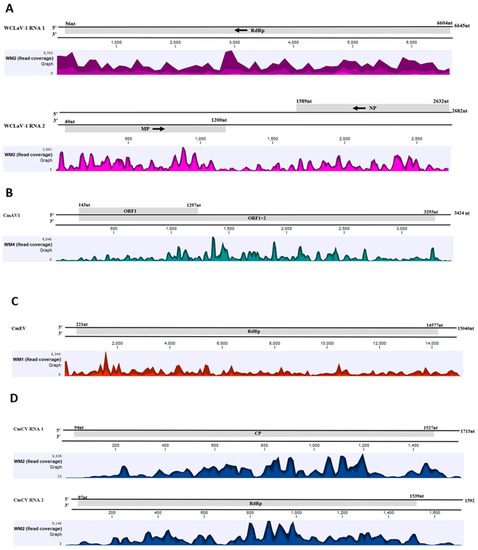 All virus isolates identified in this study had very high genetic similarity with isolates of corresponding viruses described earlier. The phylogenetic relations and detailed genome characteristics of CmAV1 [21], CmCV [48,49], CmEV [22], and WCLaV-1 [30] have been described earlier and are not repeated here.