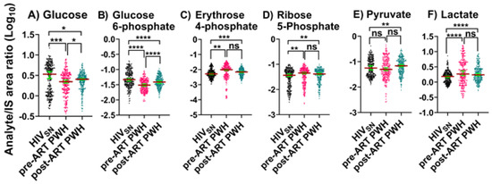 Post-ART PWH compared with HIVSN: Serum levels of glucose (p = 0.01) and G-6P (p < 0.001) remained low, while R-5P (p = 0.002), E-4P (p < 0.001), and lactate (p < 0.001) remained elevated in post-ART PWH compared with HIVSN (Figure 1A–D,F). Compared to HIVSN, pyruvate levels were not changed by HIV infection (p = 0.38), but were elevated following ART (p = 0.01) (Figure 1E).