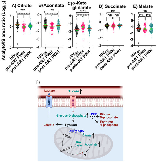 TCA cycle intermediates. The levels of (A) citrate, (B) aconitate, (C) α-KG, (D) succinate, and (E) malate in PWH before and after ART compared with HIVSN. Scatter plots show mean and significance notations of adjusted p-values (95% CI) at ** = p < 0.01, *** = p < 0.001, and **** = p < 0.0001. For multiple group comparisons, Brown–Forsythe and Welch ANOVA tests were performed in combination with Games-Howell multiple comparisons correction for sample sizes >50 with a 95% confidence interval. (F) Diagrammatic representation of metabolic pathways modified by HIV and ART. In pre-ART HIV blue text indicates pathway name, black text indicates no change, red text indicates significantly increased levels, and aqua text indicates significantly decreased levels compared with HIVSN. Solid line up-arrows (↑) indicate significantly increased and solid line down-arrows (↓) indicate significantly decreased levels following ART compared with pre-ART HIV.