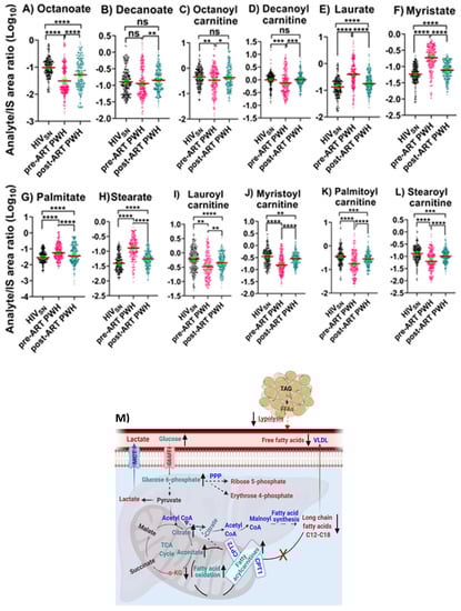 Fatty acid β-oxidation, fatty acids, and their carnitines. The levels of (A) octanoate, (B) decanoate, (C) octanoylcarnitine, (D) decanoylcarnitine, (E) laurate, (F) myristate, (G) palmitate, (H) stearate, (I) lauroylcarnitine, (J) myristoylcarnitine, (K) palmitoylcarnitine, and (L) stearoylcarnitine in PWH before and after ART compared with HIVSN. Scatter plots show the mean and significance notations of adjusted p-values (95% CI) at * = p < 0.05, ** = p < 0.01, *** = p < 0.001, and **** = p < 0.0001. For multiple group comparisons, Brown–Forsythe and Welch ANOVA tests were performed in combination with Games-Howell multiple comparisons correction for sample sizes >50 with a 95% confidence interval. (M) Diagrammatic representation of metabolic pathways modified by HIV and ART. In pre-ART HIV blue text indicates CoA conjugate, enzyme, and pathway names; black text indicates no change; red text indicates significantly increased levels; and aqua text indicates significantly decreased levels compared with HIVSN. Solid line up-arrows (↑) indicate significantly increased and solid line down-arrows (↓) indicate significantly decreased levels following ART compared with pre-ART HIV.
