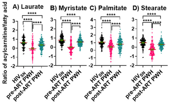 Long-chain fatty acylcarnitine and their corresponding fatty acid ratios. The ratios of (A) lauroylcarnitine to laurate, (B) myristoylcarnitine to myristate, (C) palmitoylcarnitine to palmitate, and (D) stearoylcarnitine to stearate in PWH before and after ART compared with HIVSN. Scatter plots show mean and significance notations of adjusted p-values (95% CI) at **** = p < 0.0001. For multiple group comparisons, Brown–Forsythe and Welch ANOVA tests were performed in combination with Games-Howell multiple comparisons correction for sample sizes >50 with a 95% confidence interval.