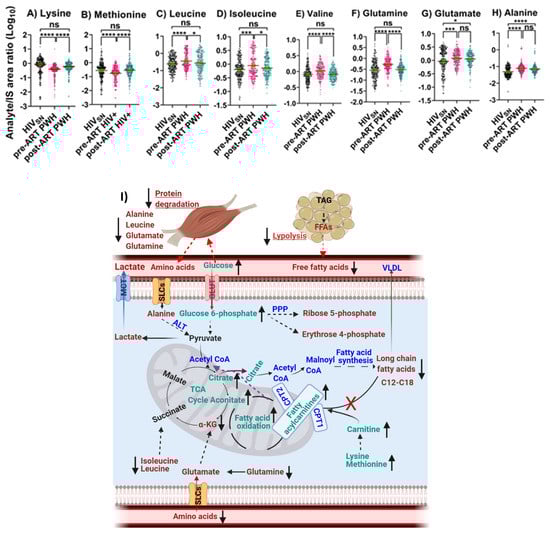 Amino acid oxidative catabolism. The levels of (A) lysine, (B) methionine, (C) leucine, (D) isoleucine, (E) valine, (F) glutamate, (G) glutamine, and (H) alanine in PWH before and after ART compared with HIVSN. Scatter plots show mean and significance notations of adjusted p-values (95% CI) at * = p < 0.05, *** = p < 0.001, and **** = p < 0.0001. For multiple group comparisons, Brown–Forsythe and Welch ANOVA tests were performed in combination with Games-Howell multiple comparisons correction for sample sizes >50 with a 95% confidence interval. (I) Diagrammatic representation of metabolic pathways modified by HIV and ART. In pre-ART HIV blue text indicates CoA conjugate, enzyme, and pathway names; black text indicates no change; red text indicates significantly increased levels; aqua text indicates significantly decreased levels, compared with HIVSN. Solid line up-arrows (↑) indicate significantly increased and solid line down-arrows (↓) indicate significantly decreased levels following ART compared with pre-ART HIV.