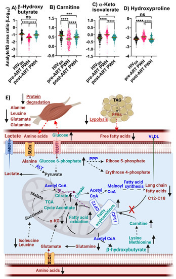 One additional potential mechanism for reduced carnitine levels is a reduction in two essential amino acids, lysine and methionine, which were decreased in pre-ART PWH. However, ART returned lysine and methionine to levels similar to HIVSN. Lysine and methionine are precursors for the de novo synthesis of carnitine [52]. Although the metabolism of amino acids primarily regulates anabolic reactions for protein synthesis, some amino acids, including branched-chain amino acids (BCAAs: leucine, isoleucine, and valine), glutaminolysis amino acids (glutamate and glutamine), and alanine, are mobilized under pathological conditions to serve as alternative energetic substrates [53]. We found that lysine and methionine were significantly reduced, while leucine, isoleucine, valine, glutamine, glutamate, and alanine were significantly elevated in pre-ART PWH compared to HIVSN. ART resulted in a normalization of all amino acids, with the exception of glutamate and alanine, to levels observed in HIVSN. In pre-ART PWH, levels of serum α-KG and α-ketoisovalerate (α-KIV, a deaminated product of valine) along with glutamine, glutamate, and BCAAs were increased, suggesting that the elevated amino acids in serum may be due to increased proteolysis associated with muscle wasting in PWH. This assumption is supported by elevated levels of serum hydroxyproline, a marker of proteolysis [54,55] that was elevated in pre-ART PWH compared with HIVSN.