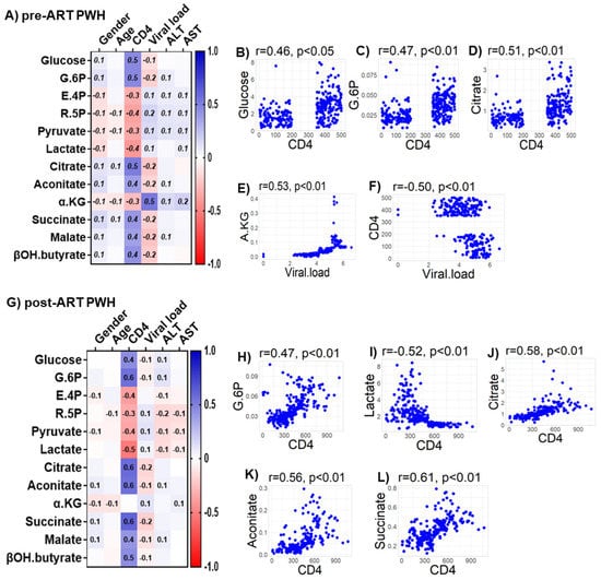 Associations between serum metabolites, demographics, and clinical markers in PWH. Heatmap visualizations of the correlations between bioenergetics substrates and age, gender, biomarkers of liver function (ALT and AST), and biomarkers of HIV disease status (CD4+ T-cell count and HIV viral load) among PWH (A) before ART and (G) after ART. Numbers in the heatmap cells are Pearson’s correlation coefficient R-values. Blue represents positive correlations and red represents negative correlations. Linear regression graphs between significantly associated covariates. (B) Glucose vs. CD4 (0.46), (C) G6P vs. CD4 (0.47), (D) citrate vs. CD4 (0.51), (E) α-KG vs. viral load (0.53), and (F) CD4 vs viral load (−0.50) in pre-ART PWH. (H) G.6P vs. CD4 (0.47), (I) lactate vs. CD4 (−0.52), (J) citrate vs. CD4 (0.58), (K) aconitate vs. CD4 (0.56), and (L) succinate vs. CD4 (0.61) in post-ART PWH.