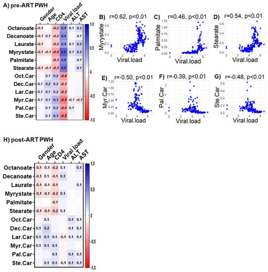 Associations between serum metabolites, demographics, and clinical markers in PWH. Heatmap visualizations of the correlations between FAO metabolic substrates and age, gender, biomarkers of liver function (ALT and AST), and biomarkers of HIV disease status (CD4+ T-cell count and HIV viral load) among PWH (A) before ART and (H) after ART. Numbers in the heatmap cells are Pearson’s correlation coefficient R-values. Blue represents positive correlations and red represents negative correlations. Linear regression graphs between significantly associated covariates. (B) myristate vs. viral load (r = 0.62), (C) palmitate vs. viral load (r = 0.46), (D) stearate vs. viral load (r = 0.54), (E) myristoylcarnitine vs. viral load (r = −0.50), (F) palmitoylcarnitine (r = −0.39), and (G) stearoylcarnitine vs. viral load (r = −0.48) in pre-ART PWH.