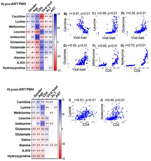Associations between serum metabolites, demographics, and clinical markers in PWH. Heatmap visualizations of the correlations between AA oxidative catabolism substrates and age, gender, biomarkers of liver function (ALT and AST), and biomarkers of HIV disease status (CD4+ T-cell count and HIV viral load) among PWH (A) before ART and (H) after ART. Numbers in the heatmap cells are Pearson’s correlation coefficient R-values. Blue represents positive correlations and red represents negative correlations. Linear regression graphs between significantly associated covariates. (B) Carnitine vs. viral load (r = −0.7), (C) leucine vs. viral load (r = 0.56), (D) glutamine vs. viral load (r = 0.59), (E) glutamate vs. viral load (r = 0.55), (F) methionine vs. CD4 (r = 0.65), and (G) isoleucine vs. CD4 (r = 0.71) in pre-ART PWH. (I) Lysine vs. CD4 (r = 0.51) and (J) isoleucine vs. CD4 (r = 0.49) in post-ART PWH.