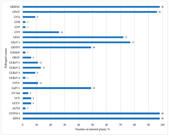 Frequency of distribution of grapevine viruses and viroids in Anapa Ampelographic Collection (percentage of the total number of collected samples).