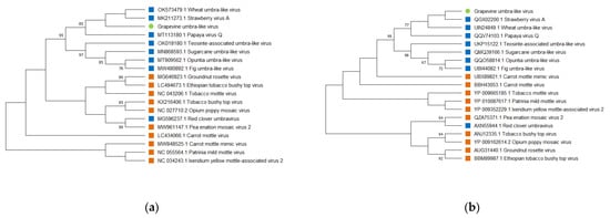- Chiapello, M.; Rodríguez-Romero, J.; Nerva, L.; Forgia, M.; Chitarra, W.; Ayllón, M.A.; Turina, M. Putative new plant viruses associated with Plasmopara viticola-infected grapevine samples. Ann. Appl. Biol. 2020, 176, 180–191. [Google Scholar] [CrossRef]