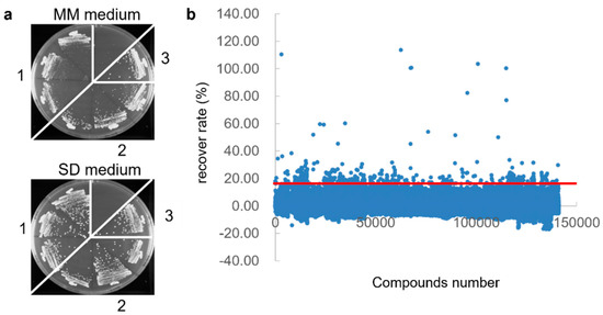 The first screening of the HIV-1 Vpr inhibitor using yeast-based high-throughput screening. (a) The growth defect of fission yeast strains with the HIV Vpr overexpression. The fission yeast cells harboring the Vpr-wild type (portion 1) or Vpr mutant R80A (portion 2), or the empty control (portion 3), were streaked on an MM medium for overexpression (upper plate) and an SD medium for repression (lower plate), and they were incubated at 30 °C for 3 days. (b) Twenty µM of 140,000 candidate compounds was added to the Vpr-expressing yeast cultured in an MM medium and cultured for 20 h. Yeast cell growth was assessed by WST-1 assay, and the proliferation recovery rate was calculated. The red line represents the hit criteria of the proliferation recovery rate of 15%, which was set as the threshold by over three-fold the standard deviation of all compounds.