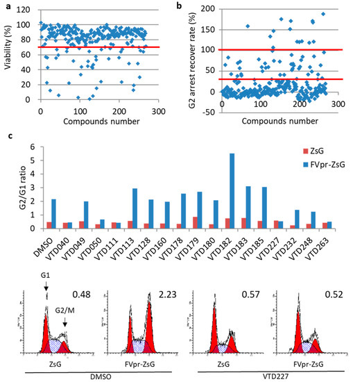 Secondary screening of Vpr inhibitor using HeLa cell-based high-throughput screening. (a) HeLa cells were treated with 10 µM of 268 candidate compounds for 48 h, and the effect on the cell viability of each compound was assessed by WST-1 assay. The red line represents the threshold for high toxicity when the treated cells showed viability under 70% compared to the DMSO-treated control. (b) The HeLa cells were transfected with pME/Flag-Vpr-IRES-ZsGreenI and incubated at 37 °C. At 4 h post-transfection, 224 candidate compounds were added at 10 µM and incubated for an additional 44 h. The cells were fixed, stained with Hoechst 33342, and analyzed using CELAVIEW RS-100. The red lines represent the threshold for inhibition ranging from over 30% and not exceeding 100% of the G2/M arrest recovery rate. (c) The inhibition of the Vpr-induced G2/M cell cycle arrest was confirmed by the flow cytometry. The HeLa cells were transfected with either pME/Flag-Vpr-IRES-ZsGreenI (FVpr-ZsG) or the control pME/Flag-IRES-ZsGreenI (ZsG) and incubated at 37 °C. At 4 h post-transfection, transfected HeLa cells were treated either with 10 µM of 17 candidate compounds or vehicle (DMSO only). After 48 h, the cells were collected and stained with propidium iodide, and the DNA content of ZsGreenI-positive cells was measured by flow cytometry. The cell cycle was analyzed by Modfit software, and the G2/G1 ratio was calculated. Results of the G2/G1 ratio of 17 candidate compounds-treated cells (upper panel) and the typical model of the cell cycle analysis of a representative drug, VTD227 (bottom panel), are shown. Arrowheads indicate peaks of cells at the G1 and G2/M phases. The G2/M:G1 ratio is indicated in the upper right of each graph.