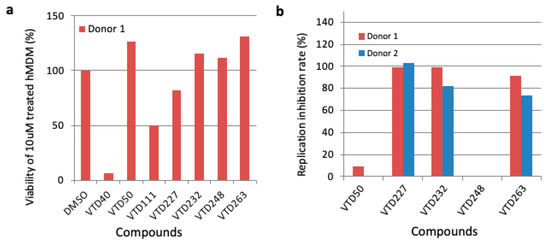 In HIV-1-infected patients, macrophages act as a viral reservoir extensively distributed in multiple tissues during ART [63,64]. Importantly, Vpr is crucial for HIV-1 replication in macrophages [4,5,6], and Vpr-mediated G2/M arrest has been implicated in efficient HIV-1 spread in macrophages [8]. Thus, to obtain a compound that suppresses Vpr-mediated G2/M arrest, thereby inhibiting HIV-1 replication in a Vpr-dependent manner in macrophages, we examined the cytotoxicity and effect of the selected seven compounds on the HIV-1 replication in MDM from healthy donors. As shown in Figure 3a, when MDM were treated with the compounds at the concentration of 10 μM, two compounds (VTD40 and VTD111) showed high cytotoxicity towards the MDM obtained from healthy donor 1 (Figure 3a). To confirm the inhibition of HIV-1 replication, we tested the compounds using an HIV-1 p24 capture ELISA. Three compounds, VTD227, VTD232, and VTD263, potently inhibited HIV-1 replication in MDM derived from two healthy donors, 1 and 2 (Figure 3b and Table 2). Due to the research’s ethical restrictions on the number of blood draws allowed in this study, it was not possible to perform statistical analysis in experiments using MDM.