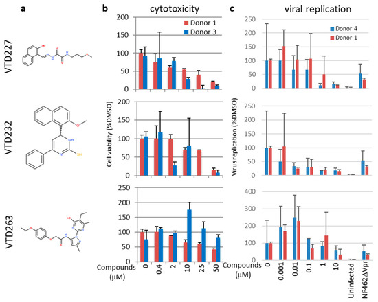 The inhibitory activity of selected compounds on the virus replication in HIV-1 NF462-infected human monocyte-derived macrophages (MDM). (a) Structure of the final selected compounds, VTD227, VTD232, and VTD 263. (b) Dose-dependent cell cytotoxicity for MDM of the final selected compounds. Differentiated MDM from healthy donors 1 and 3 were treated with 0, 0.4, 2, 10, 25, or 50 µM of 4 candidate compounds for 48 h, and cell viability was assessed by WST-1 assay. (c) Inhibition on the replication of HIV-1 NF462 by the final selected compounds. Differentiated MDM from healthy donors 1 and 4 were infected either with NF462 HIV-1 or NF462delVpr and replaced with a new medium containing 0, 0.001, 0.01, 0.1, 1, or 10 µM of 4 candidate compounds. The cells were maintained for 8 days, and the levels of virus production in the culture supernatants were measured by the p24 antigen, ELISA. A calculated 50% replication inhibitory concentration (IC50) and 50% cytotoxic concentration (CC50) are shown in Table 2. Each column and error bar represent the mean SD of the results from the duplicate samples from two donors.