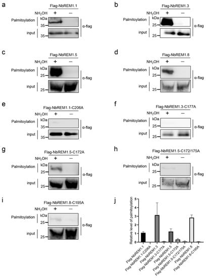 NbREM1.1 has been proven to be palmitoylated [], so we used it as a positive control for palmitoylation. In acyl-RAC assays, after the blocking of free thiols in total protein extraction with methyl methanethiosulfonate (NMT) and the cleaving of thioester linkages with hydroxylamine (NH2OH), palmitoylated NbREM1.1, NbREM1.3, NbREM1.5, or NbREM1.8 was captured by thiopropyl Sepharose in hydroxylamine-treated samples and detected by immunoblotting (Figure 1a–d,j). In contrast, no remarkable palmitoylation was detected in the NbREM1.1-C206A, NbREM1.3-C177A, and NbREM1.8-C195A point mutant proteins, in which the cysteine residues at the predicted palmitoylation sites were substituted by alanine residues (Figure 1e,f,i,j), indicating that the Cys206, Cys177, or Cys195 residue in the NbREM1.1, NbREM1.3, or NbREM1.8 protein is the essential target residue for palmitoylation, respectively. While in NbREM1.5, single-site mutation of Cys172 in NbREM1.5 could not completely abolish its palmitoylation (Figure 1g,j), but palmitoylation of NbREM1.5 was remarkably reduced when both Cys172 and Cys175 were simultaneously mutated (Figure 1h,j), indicating that NbREM1.5 was palmitoylated at both the Cys172 and Cys175 residues, in line with the results of the GPS-Palm prediction that NbREM1.5 has two predicted palmitoylation cysteines.