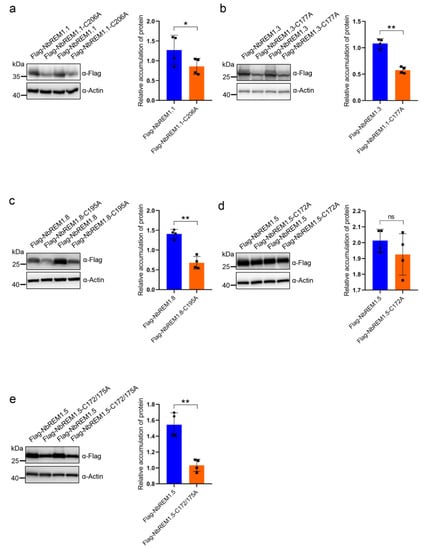 Protein accumulation assay comparison of NbREM1.1 and NbREM1.1-C206A (a), NbREM1.3 and NbREM1.3-C177A (b), NbREM1.8 and NbREM1.8-C195A (c), NbREM1.5 and NbREM1.5-C172A (d), NbREM1.5 and NbREM1.5-C172/175A (e) in N. benthamiana leaves. Data are mean ± SD (n = 4). Asterisks mark significant differences according to two-tailed Student’s t-test; * p < 0.05; ** p < 0.01; ns, no significant difference. The opposite halves of N. benthamiana leaves separately expressed flag-tagged NbREMs or their palmitoylation-defective mutants by agro-infiltration. Immunoblotting with anti-actin antibody was used as a loading control. Immunoblotting with anti-flag antibody was used to detect protein accumulation of NbREMs and its palmitoylation-defective mutants.