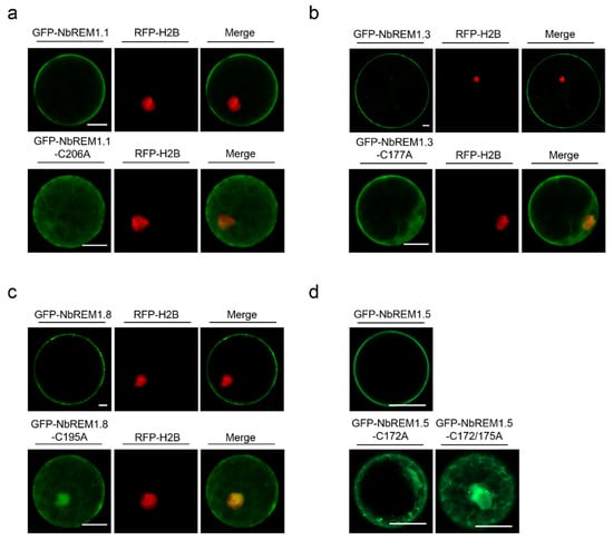 Subcellular localization of GFP-NbREMs and their respective palmitoylation-defective mutants in RFP-H2B transgenic N. benthamiana protoplast cells. (a) GFP-NbREM1.1 and GFP-NbREM1.1-C206A, (b) GFP-NbREM1.3 and GFP-NbREM1.3-C177A, (c) GFP-NbREM1.8 and GFP-NbREM1.8-C195A, (d) GFP-NbREM1.5, GFP-NbREM1.5-C172A, and GFP-NbREM1.5-C172/175A. The Z-stacks of optical sections were constructed to view the localization in protoplast using ZEN Black software. GFP-NbREMs and their palmitoylation-defective mutants were transiently expressed in transgenic N. benthamiana expressing RFP-H2B, of which the nuclei was marked by red fluorescence. The released protoplasts were collected and examined by a Zeiss LSM 880 or 980 AiryscanTM upright laser scanning confocal microscope at 48 hpi. Bar, 20 μm.