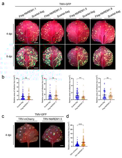 The TMV-GFP infectious clone (30B-GFPC3) [] was infiltrated into N. benthamiana leaves by A. tumefaciens infiltration; infection fluorescence spots were observed and photographed under a portable UV lamp at 4 days post-infiltration (dpi) on the inoculated leaves. TMV-GFP infection spot areas were calculated by Image Pro Plus 6.0 software (Media Cybernetics, Silver Spring, MD, USA) and were analyzed by GraphPad Prism version 8.0 (GraphPad Software, San Diego, CA, USA). Experiments were repeated at least three times. Statistical parameters SEM (standard error) are indicated in figure legends. Asterisks mark statistical significance (* 0.01 < p < 0.05; ** p < 0.01; *** p < 0.001; ns, p > 0.05, not significant) according to two-tailed Student’s t-test.